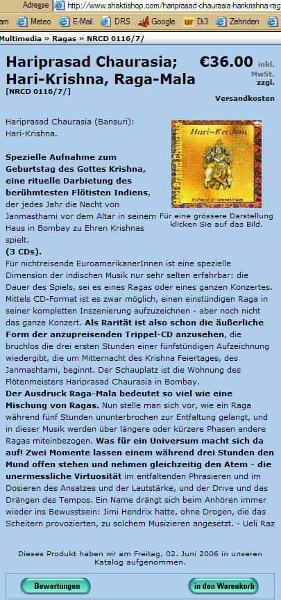 Immer wieder von neuem gruusig und schmierig zu sehen, wie Material der eigenen Website, an dem in jedem Einzelfall lange gearbeitet worden war, von Leuten geklaut und auf idiotische Weise als Eigentum für ihre Zwecke weiter verwendet wird. Diesen Text, der als kommerzielle Werbung dasteht, habe ich keineswegs jemals so geschrieben oder zur Weiterverwendung freigegeben. Was ich einst verfasste, stünde auf dieser Seite: www.ueliraz.ch/rezensionen/chaurasia.htm