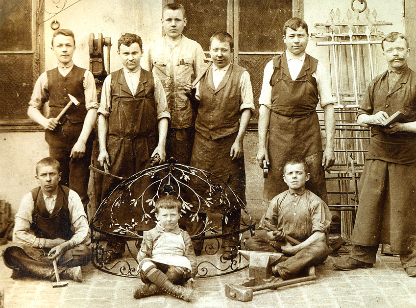 Alois Ráž vor 1901, links stehend mit Hammer